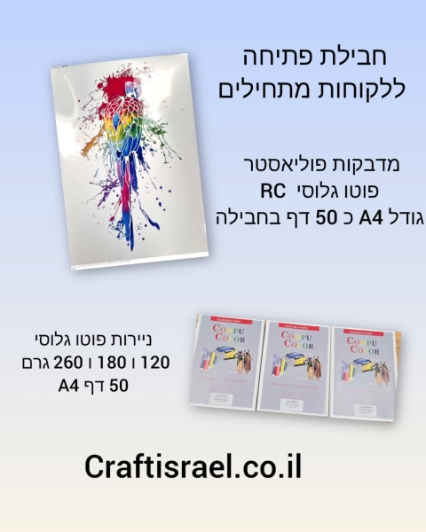 חבילת פתיחה ללקוחות מתחילים הכוללת ניירות פוטו גלוסי A4 כ 50 דף בכל חבילה במשקלים 120 גרם 180 גרם ו 260 גרם בנוסף; חבילת מדבקות פוליאסטר פוטו גלוסי RC גודל A4 כ 50 דף
